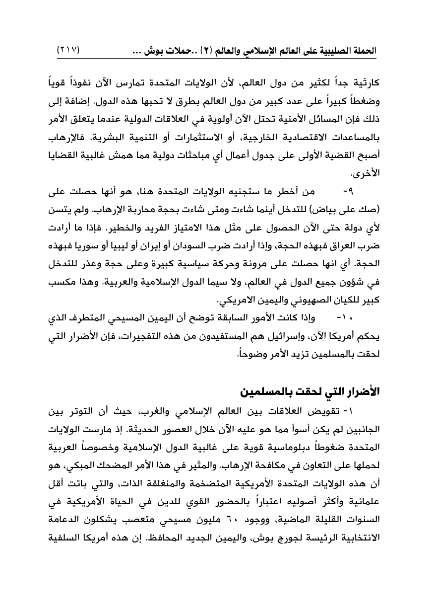 1 - تقويض العلاقات بين العالم الإسلامي والغرب، حيث أن التوتر بين الجانبين لم يكن أسوأ مما هو عليه الآن خلال العصور الحديثة. إذ مارست الولايات المتحدة ضغوطاً دبلوماسية قوية على غالبية الدول الإسلامية وخصوصاً العربية لحملها على التعاون في مكافحة الإرهاب. والمثير في هذا الأمر المضحك المبكي، هو أن هذه الولايات المتحدة الأمريكية المتضخمة والمنغلقة الذات، والتي باتت أقل علمانية وأكثر أصوليه اعتباراً بالحضور القوي للدين في الحياة الأمريكية في السنوات القليلة الماضية، ووجود 60 مليون مسيحي متعصب يشكلون الدعامة الانتخابية الرئيسة لجورج بوش، واليمين الجديد المحافظ. إن هذه أمريكا السلفية