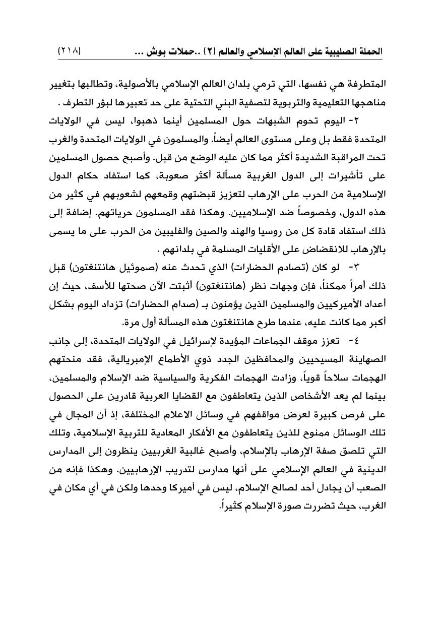 3. لو كان (تصادم الحضارات) الذي تحدث عنه (صموئيل هانتنغتون) قبل ذلك أمراً ممكناً، فإن وجهات نظر (هانتنغتون) أثبتت الآن صحتها للأسف، حيث إن أعداد الأميركيين والمسلمين الذين يؤمنون بـ (صدام الحضارات) تزداد اليوم بشكل أكبر مما كانت عليه، عندما طرح هانتنغتون هذه المسألة أول مرة.