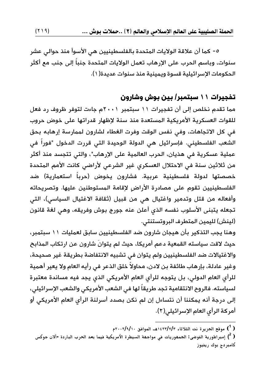 مما تقدم نخلص إلى أن تفجيرات 11 سبتمبر 2001م جاءت لتوفر ظروف رد فعل للقوات العسكرية الأمريكية المستعدة منذ سنة لإظهار قدراتها على خوض حروب في كل الاتجاهات، وفي نفس الوقت وفرت الغطاء لشارون لممارسة إرهابه بحق الشعب الفلسطيني. فإسرائيل هي الدولة الوحيدة التي قررت الدخول "فوراً في عملية عسكرية في هذيان، الحرب العالمية على الإرهاب"، والتي تتجسد منذ أكثر من ثلاثين سنة في الاحتلال العسكري غير الشرعي لأراضي كانت الأمم المتحدة خصصتها لدولة فلسطينية عربية. فشارون يخوض (حرباً استعمارية) ضد الفلسطينيين تقوم على مصادرة الأراضٍ لإقامة المستوطنين عليها. وتصريحاته وأفعاله من قتل وتدمير واغتيال هي من قبيل (ثقافة الاغتيال السياسي)، التي تجعله يتبنى الأسلوب نفسه الذي أعلن عنه جورج بوش وفريقه، وهي لغة قانون (لينش) لليمين المتطرف البروتستنتي.