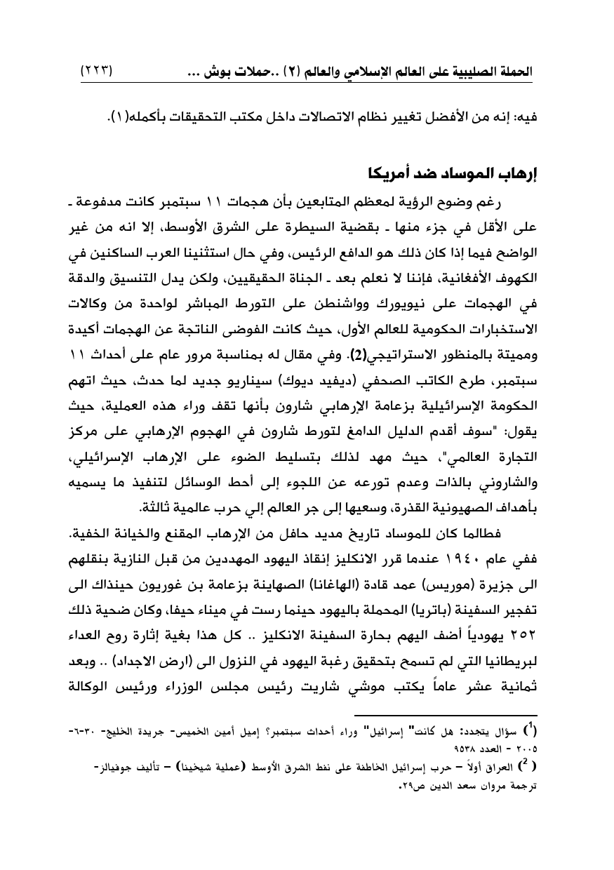 رغم وضوح الرؤية لمعظم المتابعين بأن هجمات 11 سبتمبر كانت مدفوعة ـ على الأقل في جزء منها ـ بقضية السيطرة على الشرق الأوسط، إلا انه من غير الواضح فيما إذا كان ذلك هو الدافع الرئيس، وفي حال استثنينا العرب الساكنين في الكهوف الأفغانية، فإننا لا نعلم بعد ـ الجناة الحقيقيين، ولكن يدل التنسيق والدقة في الهجمات على نيويورك وواشنطن على التورط المباشر لواحدة من وكالات الاستخبارات الحكومية للعالم الأول، حيث كانت الفوضى الناتجة عن الهجمات أكيدة ومميتة بالمنظور الاستراتيجي (¬2). وفي مقال له بمناسبة مرور عام على أحداث 11 سبتمبر، طرح الكاتب الصحفي (ديفيد ديوك) سيناريو جديد لما حدث، حيث اتهم الحكومة الإسرائيلية بزعامة الإرهابي شارون بأنها تقف وراء هذه العملية، حيث يقول: "سوف أقدم الدليل الدامغ لتورط شارون في الهجوم الإرهابي على مركز التجارة العالمي"، حيث مهد لذلك بتسليط الضوء على الإرهاب الإسرائيلي، والشاروني بالذات وعدم تورعه عن اللجوء إلى أحط الوسائل لتنفيذ ما يسميه بأهداف الصهيونية القذرة، وسعيها إلى جر العالم إلي حرب عالمية ثالثة.