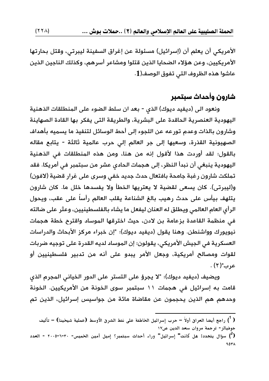 ونعود إلى (ديفيد ديوك) الذي - بعد ان سلط الضوء على المنطلقات الذهنية اليهودية العنصرية الحاقدة على البشرية، والطريقة التى يفكر بها القادة الصهاينة وشارون بالذات وعدم تورعه عن اللجوء إلى أحط الوسائل لتنفيذ ما يسميه بأهداف الصهيونية القذرة، وسعيها إلى جر العالم إلي حرب عالمية ثالثة - يتابع مقاله بالقول: لقد أوردت هذا لأقول إنه من هنا، ومن هذه المنطلقات في الذهنية اليهودية ينبغي أن نبدأ النظر، إلى هجمات الحادي عشر من سبتمبر في أمريكا. فقد تملكت شارون رغبة جامحة بافتعال حدث جديد خفي وسرى على غرار قضية (لافون) و (ليبرتى). كان يسعى لقضية لا يعتريها الخطأ ولا يفسدها خلل ما. كان شارون يتلهف بيأس على حدث رهيب بالغ الشناعة يقلب العالم رأساً على عقب، ويحول الرأي العام العالمي ويطلق له العنان ليفعل ما يشاء بالفلسطينيين، وعثر على ضالته في منظمة القاعدة بزعامة بن لادن، حيث اخترقها الموساد واقترح خطة هجمات نيويورك وواشنطن. وهنا يقول (ديفيد ديوك): "إن خبراء مركز الأبحاث والدراسات العسكرية في الجيش الأمريكي، يقولون: إن الموساد لديه القدرة على توجيه ضربات لقوات ومصالح أمريكية، وجعل الأمر يبدو على أنه من تدبير فلسطينيين أو عرب" (¬2).