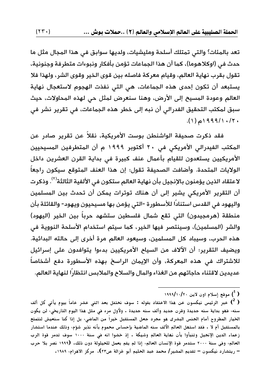 فقد ذكرت صحيفة الواشنطن بوست الأمريكية، نقلاً عن تقرير صادر عن المكتب الفيدرالي الأمريكي في 20 أكتوبر 1999 م أن المتطرفين المسيحيين الأمريكيين يستعدون للقيام بأعمال عنف كبيرة في بداية القرن العشرين داخل الولايات المتحدة. وأضافت الصحيفة تقول: إن هذا العنف المتوقع سيكون راجعاً لاعتقاد الذين يؤمنون بالإنجيل بأن نهاية العالم ستكون في الألفية الثالثة (¬2). وذكرت أن التقرير الأمريكي يشير إلى أن هناك توترات يمكن أن تحدث بين المسلمين واليهود في القدس استنادًا للأسطورة -التي يؤمن بها مسيحيون ويهود- والقائلة بأن منطقة (هرمجيدون) التي تقع شمال فلسطين ستشهد حرباً بين الخير (اليهود) والشر (المسلمين)، وسينتصر فيها الخير، كما سيتم استخدام الأسلحة النووية في هذه الحرب، وسيباد كل المسلمين، وسيعود العالم مرة أخرى إلى حالته البدائية.
