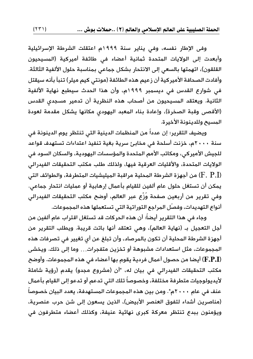 ويضيف التقرير: إن عدداً من المنظمات الدينية التي تنتظر يوم الدينونة في سنة 2000م، خزنت أسلحة في مخابئ سرية بغية تنفيذ اعتداءات تستهدف قواعد للجيش الأميركي، ومكاتب الأمم المتحدة والمؤسسات اليهودية، والسكان السود في الولايات المتحدة، والأقليات العرقية فيها، ولذلك طلب مكتب التحقيقات الفيدرالي ( F. P.I) من أجهزة الشرطة المحلية مراقبة الميليشيات المتطرفة، والطوائف التي يمكن أن تستغل حلول عام ألفين للقيام بأعمال إرهابية أو عمليات انتحار جماعي. وفي تقرير من أربعين صفحة وُزِّع عبر العالم، أوضح مكتب التحقيقات الفيدرالي أنواع التهديدات، وفصّل المراجع التوراتية التي تستعملها هذه المجموعات.
