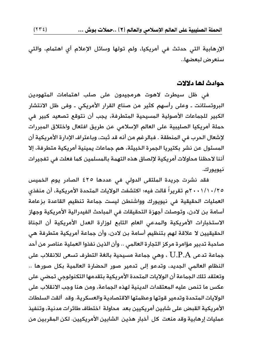 فقد نشرت جريدة الملتقى الدولي في عددها 425 الصادر يوم الخميس 25/ 10/2001م تقريراً قالت فيه: اكتشفت الولايات المتحدة الأمريكية، أن منفذي العمليات الحقيقية في نيويورك وواشنطن ليست جماعة تنظيم القاعدة بزعامة أسامة بن لادن، وتوصلت أجهزة التحقيقات في المباحث الفيدرالية الأمريكية وجهاز الاستخبارات الأمريكية والمدعي العام التابع لوزارة العدل الأمريكية أن الجناة الحقيقيين لا علاقة لهم بتنظيم أسامة بن لادن، وأن جماعة أمريكية متطرفة هي صاحبة تدبير مؤامرة مركز التجارة العالمي .. وأن الذين نفذوا العملية عناصر من أحد جماعة تدعى U.P.A، وهي جماعة مسيحية بالغة التطرف تسعى للانقلاب على النظام العالمي الجديد، وتدعو إلى تدمير صور الحضارة العالمية بكل صورها .. وتعتقد تلك الجماعة أن الولايات المتحدة الأمريكية بتقدمها التكنولوجي تمضي على عكس ما تنص عليه المعتقدات الدينية لهذه الجماعة، ومن هنا وجب الانقلاب على الولايات المتحدة وتدمير قوتها وعظمتها الاقتصادية والعسكرية. وقد ألقت السلطات الأمريكية القبض على شابين أمريكيين بعد محاولة اختطاف طائرات مدنية، وتنفيذ عمليات إرهابية وقد منعت كل أخبار هذين الشابين الأمريكيين. لكن المقربين من
