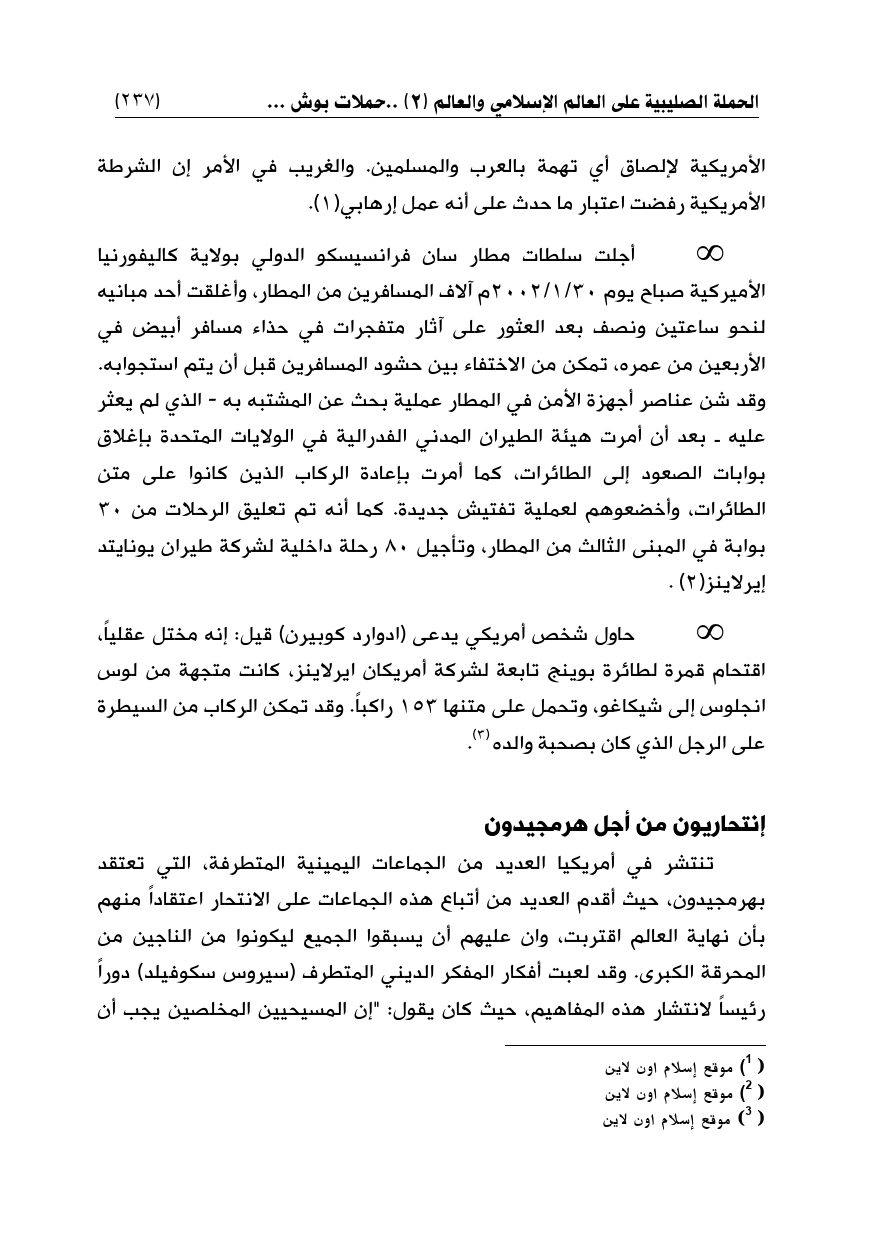 الأمريكية لإلصاق أي تهمة بالعرب والمسلمين. والغريب في الأمر إن الشرطة الأمريكية رفضت اعتبار ما حدث على أنه عمل إرهابي (¬1).
