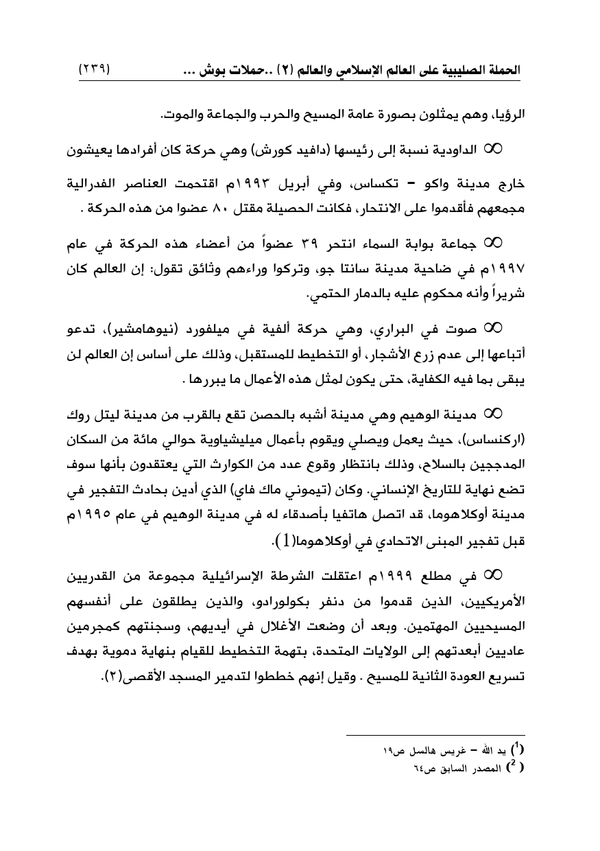 - في مطلع 1999م اعتقلت الشرطة الإسرائيلية مجموعة من القدريين الأمريكيين، الذين قدموا من دنفر بكولورادو، والذين يطلقون على أنفسهم المسيحيين المهتمين. وبعد أن وضعت الأغلال في أيديهم، وسجنتهم كمجرمين عاديين أبعدتهم إلى الولايات المتحدة، بتهمة التخطيط للقيام بنهاية دموية بهدف تسريع العودة الثانية للمسيح. وقيل إنهم خططوا لتدمير المسجد الأقصى (¬2).