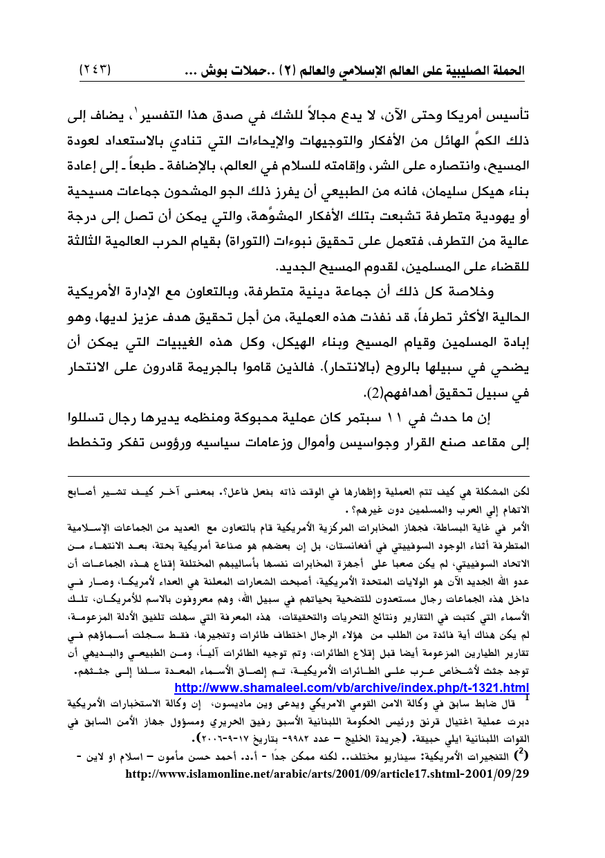 وخلاصة كل ذلك أن جماعة دينية متطرفة، وبالتعاون مع الإدارة الأمريكية الحالية الأكثر تطرفاً، قد نفذت هذه العملية، من أجل تحقيق هدف عزيز لديها، وهو إبادة المسلمين وقيام المسيح وبناء الهيكل، وكل هذه الغيبيات التي يمكن أن يضحي في سبيلها بالروح (بالانتحار). فالذين قاموا بالجريمة قادرون على الانتحار في سبيل تحقيق أهدافهم (¬2).