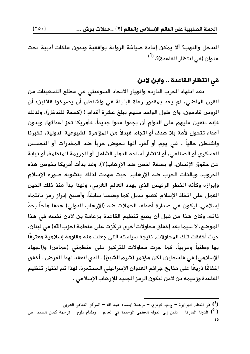 بعد انتهاء الحرب الباردة وانهيار الاتحاد السوفيتي في مطلع التسعينات من القرن الماضي، لم يعد بمقدور رعاة البلبلة في واشنطن أن يصرخوا قائلين: أن الروس قادمون، وان طول الواحد منهم يبلغ عشرة أقدام! (كحجة للتدخل)، ولذلك فإنه يتعين عليهم على الدوام أن يجدوا عدوا جديداً. فأمريكا تعز أعدائها، وبدون أعداء تتحول لأمة بلا هدف أو اتجاه. فبدلاً من المؤامرة الشيوعية الدولية، تخبرنا واشنطن حالياً ـ في يوم أو آخرـ أنها تخوض حرباً ضد المخدرات أو التجسس العسكري أو الصناعي، أو انتشار أسلحة الدمار الشامل أو الجريمة المنظمة، أو نيابة عن حقوق الإنسان، أو بصفة اخص ضد الإرهاب (¬2). وقد بدأت أمريكا بخوض هذه الحروب، وبالذات الحرب ضد الإرهاب، حيث مهدت لذلك بتشويه صوره الإسلام وإبرازه وكأنه الخطر الرئيس الذي يهدد العالم الغربي، ولهذا بدأ منذ ذلك الحين العمل على اتخاذ الإسلام كعدو بديل كما وضحنا سابقاً، وأصبح إبراز رمز بانتماء إسلامي، ليكون في صدارة أهداف الحملات ضد (الإرهاب الدولي) هدفا ملحاً بحدّ ذاته، وكان هذا من قبل أن يضع تنظيم القاعدة بزعامة بن لادن نفسه في هذا الموضع، لا سيما بعد إخفاق محاولات أخرى تركَّزت على منظمة (حزب الله) في لبنان، حيث أخفقت تلك المحاولات، نتيجة سياسته التي جعلت منه مقاومة إسلامية معترفًا بها وطنياً وعربياً. كما جرت محاولات للتركيز على منظمتي (حماس) و (الجهاد الإسلامي) في فلسطين، لكن مؤتمر (شرم الشيخ) ـ الذي انعقد لهذا الغرض ـ أخفق إخفاقًا ذريعًا على مذابح جرائم العدوان الإسرائيلي المستمرة. لهذا تم اختيار تنظيم القاعدة وزعيمه بن لادن ليكون الرمز الجديد للإرهاب الإسلامي.