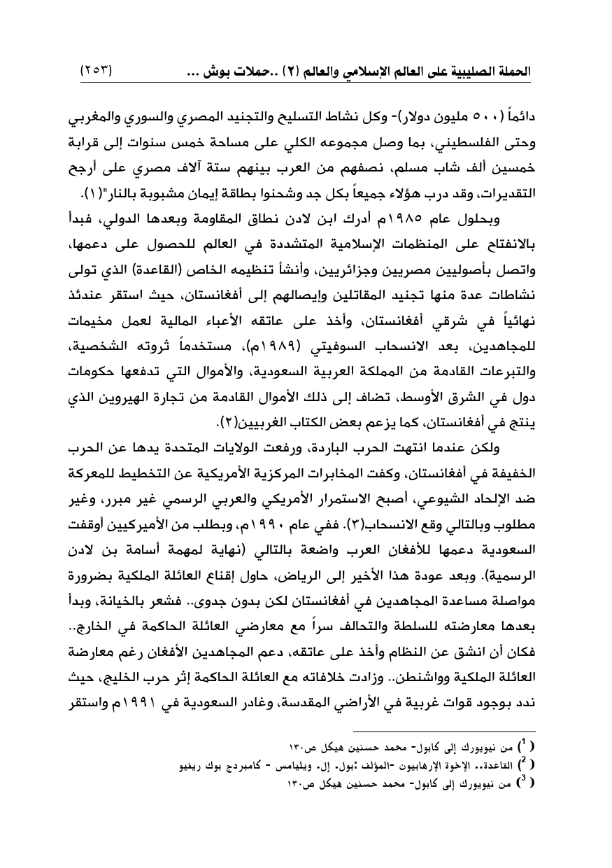 دائماً (500 مليون دولار) - وكل نشاط التسليح والتجنيد المصري والسوري والمغربي وحتى الفلسطيني، بما وصل مجموعه الكلي على مساحة خمس سنوات إلى قرابة خمسين ألف شاب مسلم، نصفهم من العرب بينهم ستة آلاف مصري على أرجح التقديرات، وقد درب هؤلاء جميعاً بكل جد وشحنوا بطاقة إيمان مشبوبة بالنار" (¬1).
