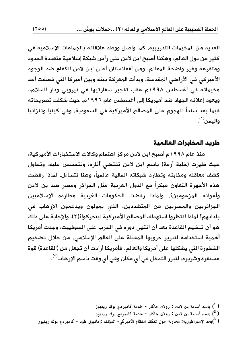 العديد من المخيمات التدريبية، كما واصل ووطد علاقاته بالجماعات الإسلامية في كثير من دول العالم، وهكذا أصبح ابن لادن على رأس شبكة إسلامية متعددة الحدود ومتفرعة وغير واضحة المعالم. ومن أفغانستان أعلن ابن لادن الكفاح ضد الوجود الأميركي في الأراضي المقدسة، وبدأت المعركة بينه وبين أميركا التي قصفت أحد مخيماته في أغسطس 1998م عقب تفجير سفارتيها في نيروبي ودار السلام .. ويعود إعلانه الجهاد ضد أميريكا إلى أغسطس عام 1996م، حيث شكلت تصريحاته فيما بعد سنداً للهجوم على المصالح الأميركية في السعودية، وفي كينيا وتنزانيا واليمن (¬1).