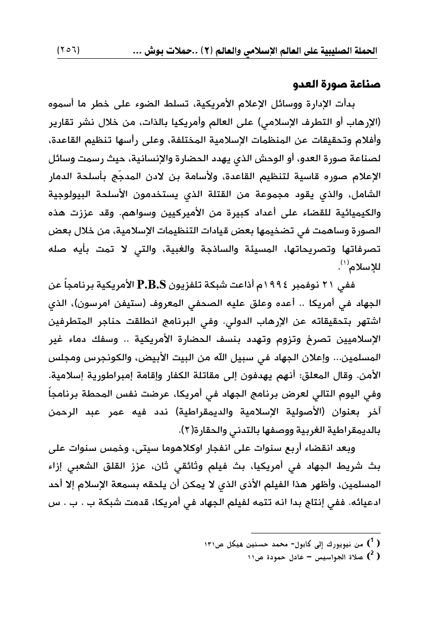 ففي 21 نوفمبر 1994م أذاعت شبكة تلفزيون P.B.S الأمريكية برنامجاً عن الجهاد في أمريكا .. أعده وعلق عليه الصحفي المعروف (ستيفن امرسون)، الذي اشتهر بتحقيقاته عن الإرهاب الدولي. وفي البرنامج انطلقت حناجر المتطرفين الإسلاميين تصرخ وتزوم وتهدد بنسف الحضارة الأمريكية .. وسفك دماء غير المسلمين ... وإعلان الجهاد في سبيل الله من البيت الأبيض، والكونجرس ومجلس الأمن. وقال المعلق: أنهم يهدفون إلى مقاتلة الكفار وإقامة إمبراطورية إسلامية. وفي اليوم التالي لعرض برنامج الجهاد في أمريكا، عرضت نفس المحطة برنامجاً آخر بعنوان (الأصولية الإسلامية والديمقراطية) ندد فيه عمر عبد الرحمن بالديمقراطية الغربية ووصفها بالتدني والحقارة (¬2).