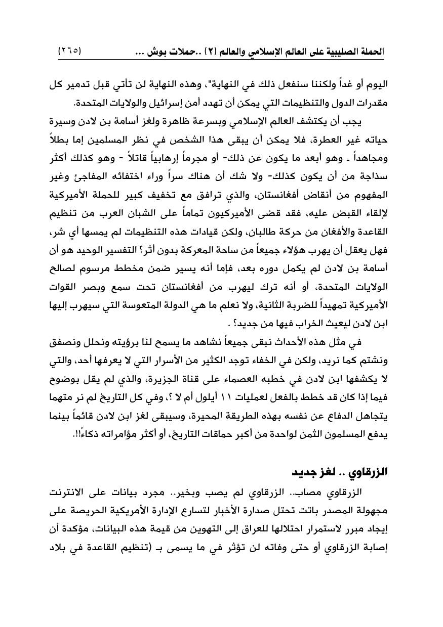 يجب أن يكتشف العالم الإسلامي وبسرعة ظاهرة ولغز أسامة بن لادن وسيرة حياته غير العطرة، فلا يمكن أن يبقى هذا الشخص في نظر المسلمين إما بطلاً ومجاهداً ـ وهو أبعد ما يكون عن ذلك- أو مجرماً إرهابياً قاتلاً - وهو كذلك أكثر سذاجة من أن يكون كذلك- ولا شك أن هناك سراً وراء اختفائه المفاجئ وغير المفهوم من أنقاض أفغانستان، والذي ترافق مع تخفيف كبير للحملة الأميركية لإلقاء القبض عليه، فقد قضى الأميركيون تماماً على الشبان العرب من تنظيم القاعدة والأفغان من حركة طالبان، ولكن قيادات هذه التنظيمات لم يمسها أي شر، فهل يعقل أن يهرب هؤلاء جميعاً من ساحة المعركة بدون أثر؟ التفسير الوحيد هو أن أسامة بن لادن لم يكمل دوره بعد، فإما أنه يسير ضمن مخطط مرسوم لصالح الولايات المتحدة، أو أنه ترك ليهرب من أفغانستان تحت سمع وبصر القوات الأميركية تمهيداً للضربة الثانية، ولا نعلم ما هي الدولة المتعوسة التي سيهرب إليها ابن لادن ليعيث الخراب فيها من جديد؟.