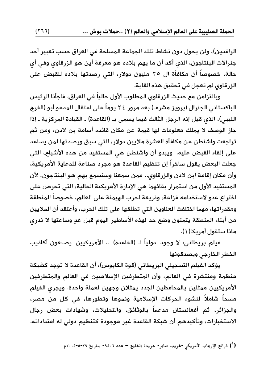 الرافدين)، ولن يحول دون نشاط تلك الجماعة المسلحة في العراق حسب تعبير أحد جنرالات البنتاجون، الذي أكد أن ما يهم بلاده هو معرفة أين هو الزرقاوي وفي أي حالة، خصوصاً أن مكافأة ال 25 مليون دولار، التي رصدتها بلاده للقبض على الزرقاوي لم تعجل في تحقيق هذه الغاية.