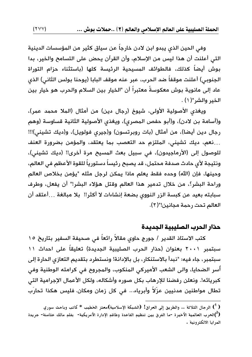 وفي الحين الذي يبدو ابن لادن خارجاً عن سياق كثير من المؤسسات الدينية التي أعلنت أن هذا ليس من الإسلام، وأن القرآن يحض على التسامح والخير، بدا بوش أيضاً كذلك، فالطوائف المسيحية الرئيسة كلها (باستثناء حزام التوراة الجنوبي) أعلنت موقفاً ضد الحرب، عبر عنه موقف البابا (يوحنا بولس الثاني) الذي عاد إلى مانوية بوش معكوسةً معتبراً أن "الخيار بين السلام والحرب هو خيار بين الخير والشر" (¬1).