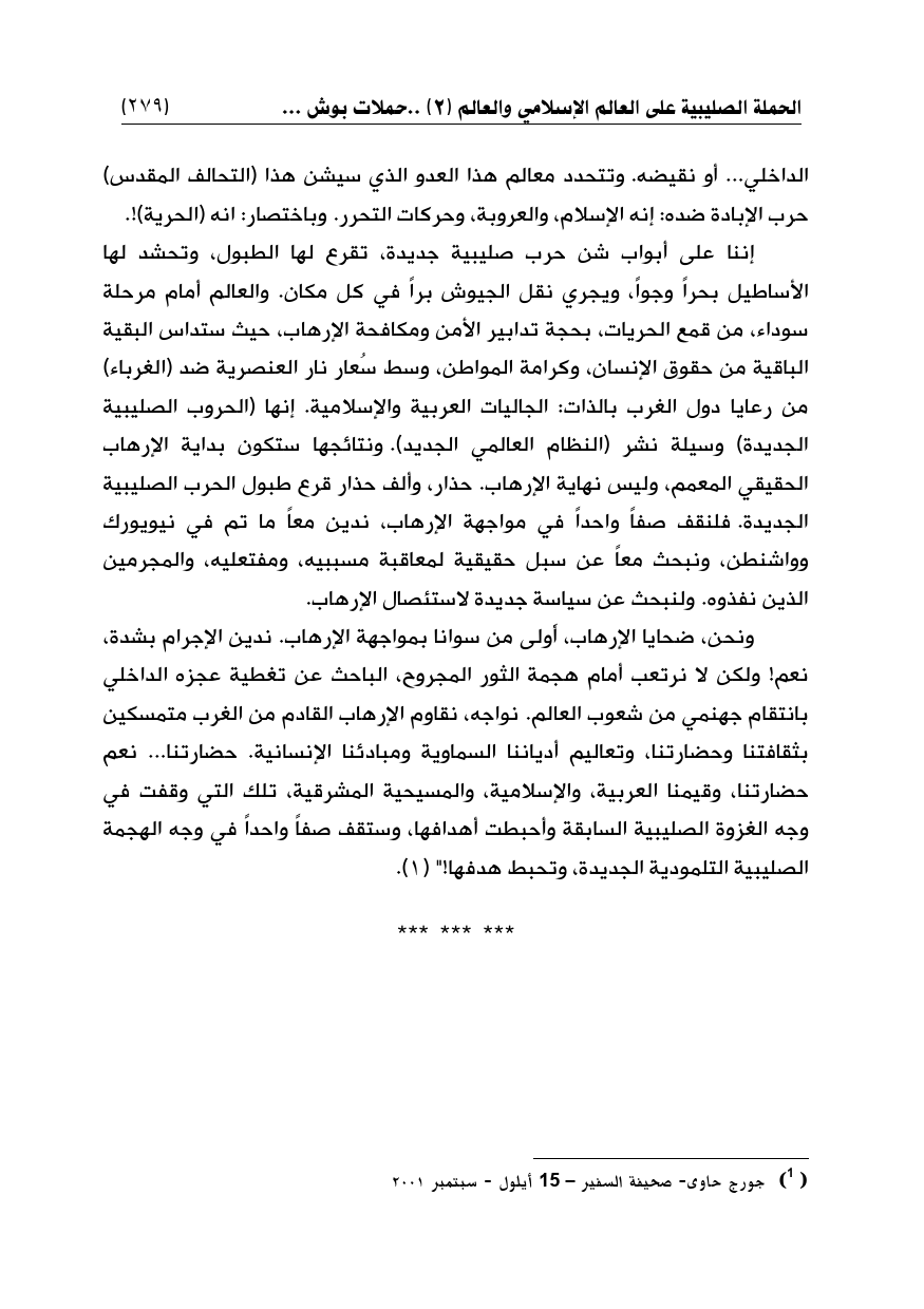 إننا على أبواب شن حرب صليبية جديدة، تقرع لها الطبول، وتحشد لها الأساطيل بحراً وجواً، ويجري نقل الجيوش براً في كل مكان. والعالم أمام مرحلة سوداء، من قمع الحريات، بحجة تدابير الأمن ومكافحة الإرهاب، حيث ستداس البقية الباقية من حقوق الإنسان، وكرامة المواطن، وسط سُعار نار العنصرية ضد (الغرباء) من رعايا دول الغرب بالذات: الجاليات العربية والإسلامية. إنها (الحروب الصليبية الجديدة) وسيلة نشر (النظام العالمي الجديد). ونتائجها ستكون بداية الإرهاب الحقيقي المعمم، وليس نهاية الإرهاب. حذار، وألف حذار قرع طبول الحرب الصليبية الجديدة. فلنقف صفاً واحداً في مواجهة الإرهاب، ندين معاً ما تم في نيويورك وواشنطن، ونبحث معاً عن سبل حقيقية لمعاقبة مسببيه، ومفتعليه، والمجرمين الذين نفذوه. ولنبحث عن سياسة جديدة لاستئصال الإرهاب.