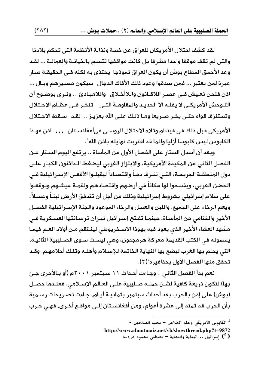 لقد كشف احتلال الأمريكان للعراق عن خسة ونذالة الأنظمة التى تحكم بلادنا والتى لم تقف موقفا واحدا مشرفا بل كانت مواقفها تتسم بالخيانة والعمالة ... لقد وعد الأحمق المطاع بوش أن يكون العراق نموذجا يحتذى به لكنه في الحقيقة صار عبرة لمن يعتبر ... فمن صدقوا وعود ذلك الأفاك الدجال سيكون مصيرهم وبال ... اذن فنحن نعيش في عصر اللاقانون واللاأخلاق واللامبادئ ... ونرى بوضوح أن التوحش الأمريكى لا يفله الا الحديد والمقاومة التى تنخر في عظام الاحتلال وتستنزف قواه حتى يخر صريعا وما ذلك على الله بعزيز ... لقد سقط الاحتلال الأمريكى قبل ذلك في فيتنام وتلاه الاحتلال الروسى فىأفغانستان ... اذن فهذا الكابوس ليس كابوسا أزليا وانما قد اقتربت نهايته باذن الله (¬1).