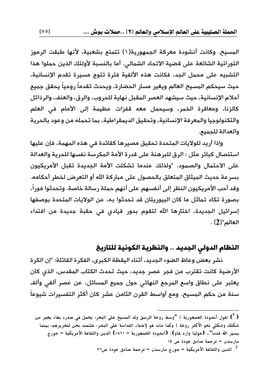 (¬1) تقول أنشودة الجمهورية: "وسط روعة الزنبق ولد المسيح على البحر، يحمل في صدره بهاء يغير من شكلك وشكلي نحو الأكثر روعة: وكما مات هو لإضفاء القداسة على البشر، فلنمت نحن لتحريرهم، بينما يسير الله قدماً". (جوليا وارد هاو)، (أنشودة الجمهورية - 1861) الدين والثقافة الأمريكية - جورج مارسدن - ترجمة صادق عودة ص 15