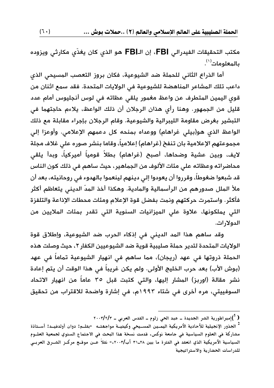 وقد ساهم هذا المد الديني في إذكاء الحرب ضد الشيوعية، وإطلاق قوة الولايات المتحدة لتدير حملة صليبية قوية ضد الشيوعيين الكفار (¬2)، حيث وصلت هذه الحملة ذروتها في عهد (ريجان)، مما ساهم في انهيار الشيوعية تماماً في عهد (بوش الأب) بعد حرب الخليج الأولى. ولم يكن غريباً في هذا الوقت أن يتم إعادة نشر مقالة (اوربز) المشار إليها، والتي كتبت قبل 35 عاماً من انهيار الاتحاد السوفييتي، مره أخرى في شتاء 1993م، في إشارة واضحة للاقتراب من تحقيق