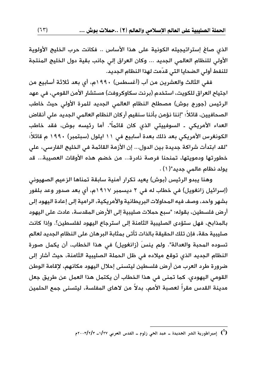 وهنا يبدو الرئيس (بوش) يعيد تكرار أمنية سابقة تمناها الزعيم الصهيوني (إسرائيل زانغويل) في خطاب له في 2 ديسمبر 1917م، أي بعد صدور وعد بلفور بشهر واحد، وصف فيه المحاولات البريطانية والأمريكية، الرامية إلى إعادة اليهود إلى أرض فلسطين، بقوله: "سبع حملات صليبية إلى الأرض المقدسة، عادت على اليهود بالمذابح، فهل ستؤدى الصليبية الثامنة إلى استرجاع اليهود لفلسطين؟. وإذا كانت صليبية حقة، فإن تلك الحقيقة بالذات تأتى بمثابة البرهان على النظام الجديد لعالم تسوده المحبة والعدالة". ولم ينسَ (زانغويل) في هذا الخطاب، أن يكمل صورة النظام الجديد الذي توقع ميلاده في ظل الحملة الصليبية الثامنة، حيث أشار إلى ضرورة طرد العرب من أرض فلسطين ليتسنى إحلال اليهود مكانهم، لإقامة الوطن القومي اليهودي. كما تمنى في هذا الخطاب أن يكتمل هذا العمل عن طريق جعل مدينة القدس مقراً لعصبة الأمم، بدلاً من لاهاى المفلسة، ليتسنى جمع الحلمين