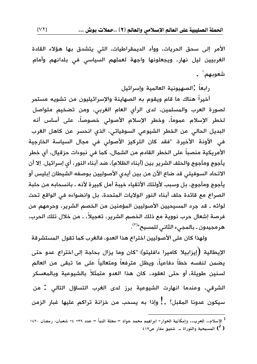 أخيراً هناك ما قام ويقوم به الصهاينة والإسرائيليون من تشويه مستمر لصورة العرب والمسلمين، لدى الرأي العام الغربي، ومن تضخيم متواصل لخطر الإسلام عموماً، وخطر الإسلام الأصولي خصوصاً، على أساس أنه البديل الحالي عن الخطر الشيوعي السوفياتي، الذي انحسر عن كاهل الغرب في الآونة الأخيرة. "فقد كان التركيز الأصولي في مجال السياسة الخارجية الأمريكية منصباً على الخطر القادم من الشمال، كما في نبوءات حزقيال، أي خطر يأجوج ومأجوج والحلف الشرير بين (أبناء الظلام)، ضد أبناء النور، أي إسرائيل. إلا أن الاتحاد السوفيتي قد ضاع الآن من بين أيدي الأصوليين بوصفه الشيطان إبليس أو يأجوج ومأجوج، بل وسبب لأولئك الأتقياء خيبة أمل كبيرة لأنه ـ بانسحابه من حلبة الصراع مع قائدة حلف أبناء النور الولايات المتحدة، بل وانضواءه في الواقع تحت لوائه ـ قد جرد المسيحيين الأصوليين المؤمنين من الخصم الشرير، وحرمهم من فرصة إشعال حرب نووية مع ذلك الخصم الشرير، تعجيلاً، ـ من خلال تلك الحرب، هرمجيدون ـ بالمجيء الثاني للمسيح" (¬2).