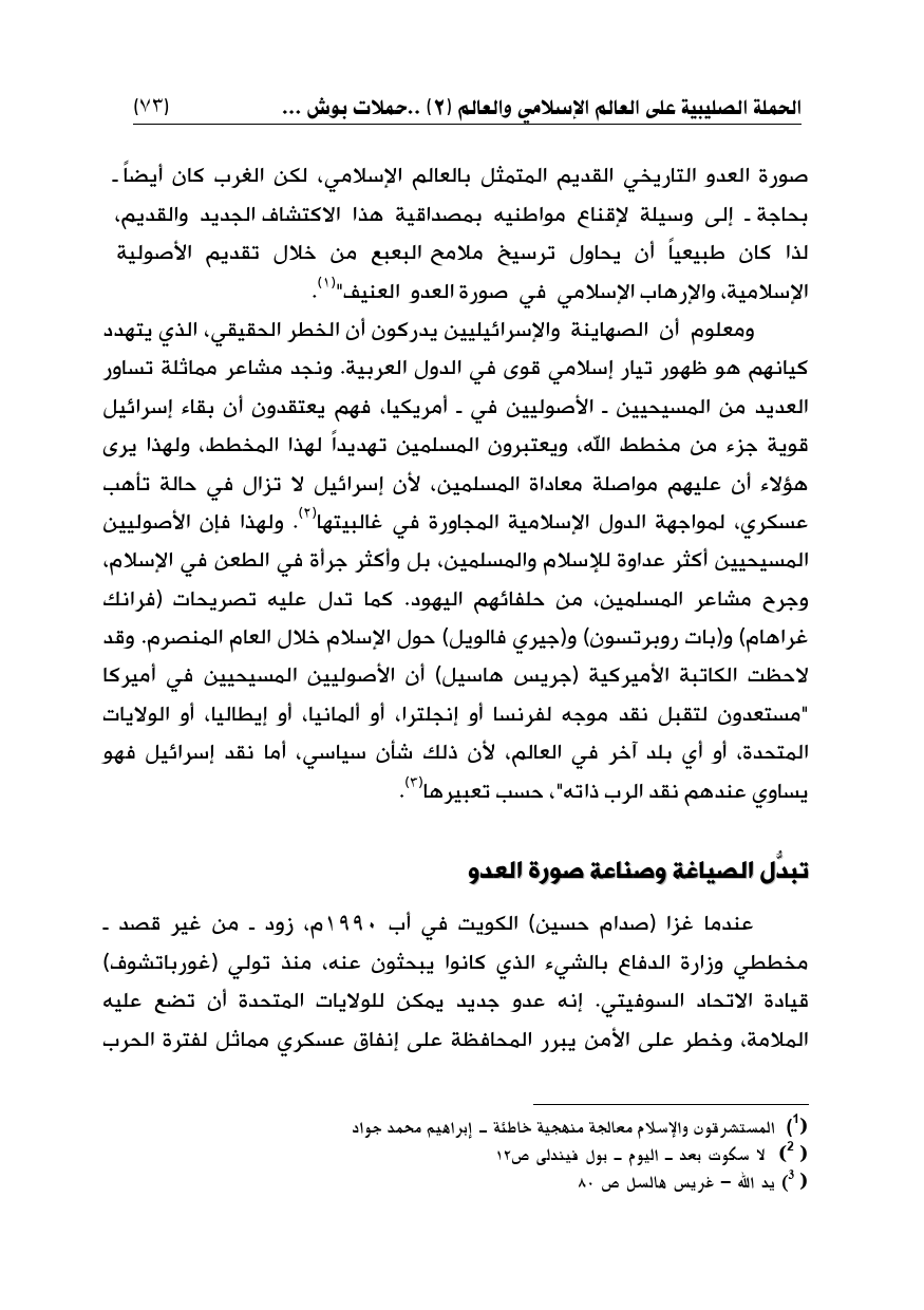 ومعلوم أن الصهاينة والإسرائيليين يدركون أن الخطر الحقيقي، الذي يتهدد كيانهم هو ظهور تيار إسلامي قوى في الدول العربية. ونجد مشاعر مماثلة تساور العديد من المسيحيين ـ الأصوليين في ـ أمريكيا، فهم يعتقدون أن بقاء إسرائيل قوية جزء من مخطط الله، ويعتبرون المسلمين تهديداً لهذا المخطط، ولهذا يرى هؤلاء أن عليهم مواصلة معاداة المسلمين، لأن إسرائيل لا تزال في حالة تأهب عسكري، لمواجهة الدول الإسلامية المجاورة في غالبيتها (¬2). ولهذا فإن الأصوليين المسيحيين أكثر عداوة للإسلام والمسلمين، بل وأكثر جرأة في الطعن في الإسلام، وجرح مشاعر المسلمين، من حلفائهم اليهود. كما تدل عليه تصريحات (فرانك غراهام) و (بات روبرتسون) و (جيري فالويل) حول الإسلام خلال العام المنصرم. وقد لاحظت الكاتبة الأميركية (جريس هاسيل) أن الأصوليين المسيحيين في أميركا "مستعدون لتقبل نقد موجه لفرنسا أو إنجلترا، أو ألمانيا، أو إيطاليا، أو الولايات المتحدة، أو أي بلد آخر في العالم، لأن ذلك شأن سياسي، أما نقد إسرائيل فهو يساوي عندهم نقد الرب ذاته"، حسب تعبيرها (¬3).