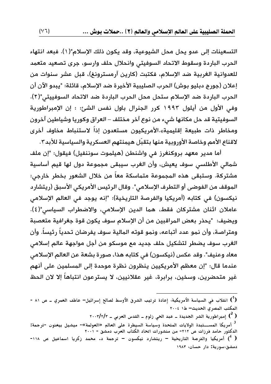 التسعينات إلى عدو يحل محل الشيوعية، وقد يكون ذلك الإسلام" (¬1). فبعد انتهاء الحرب الباردة وسقوط الاتحاد السوفيتي وانحلال حلف وارسو، جرى تصعيد متعمد للعدوانية الغربية ضد الإسلام، فكتبت (كارين آرمسترونغ)، قبل عشر سنوات من إعلان (جورج دبليو بوش) الحرب الصليبية الأخيرة ضد الإسلام، قائلة: "يبدو الآن أن الحرب الباردة ضد الإسلام ستحل محل الحرب الباردة ضد الاتحاد السوفييتي" (¬2). وفي الأول من أيلول 1993 كرر الجنرال باول نفس الشئ:: إن الإمبراطورية السوفيتية قد حل مكانها شيء من نوع آخر مختلف - العراق وكوريا وشياطين آخرون ومخاطر ذات طبيعة إقليمية».الأمريكيون مستعدون إذاً لاستنباط مخاوف أخرى لاقناع الأمم وخاصة الأوروبية منها بتقبّل هيمنتهم العسكرية والسياسية للأبد (¬3).