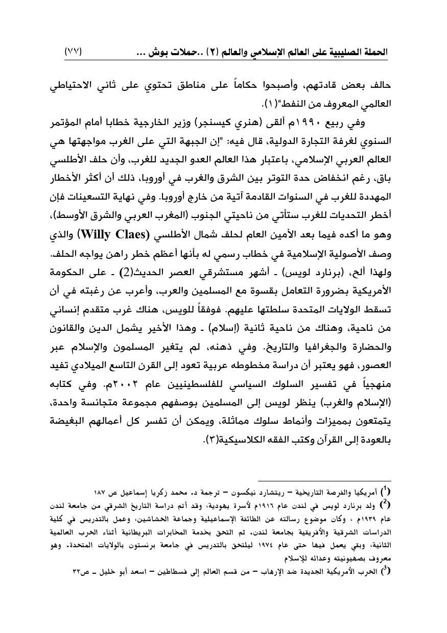 وفي ربيع 1990م ألقى (هنري كيسنجر) وزير الخارجية خطابا أمام المؤتمر السنوي لغرفة التجارة الدولية، قال فيه: "إن الجبهة التي على الغرب مواجهتها هي العالم العربي الإسلامي، باعتبار هذا العالم العدو الجديد للغرب، وأن حلف الأطلسي باق، رغم انخفاض حدة التوتر بين الشرق والغرب في أوروبا، ذلك أن أكثر الأخطار المهددة للغرب في السنوات القادمة آتية من خارج أوروبا. وفي نهاية التسعينات فإن أخطر التحديات للغرب ستأتي من ناحيتي الجنوب (المغرب العربي والشرق الأوسط)، وهو ما أكده فيما بعد الأمين العام لحلف شمال الأطلسي Willy Claes)) والذي وصف الأصولية الإسلامية في خطاب رسمي له بأنها أعظم خطر راهن يواجه الحلف. ولهذا ألح، (برنارد لويس) ـ أشهر مستشرقي العصر الحديث (¬2) ـ على الحكومة الأمريكية بضرورة التعامل بقسوة مع المسلمين والعرب، وأعرب عن رغبته في أن تسقط الولايات المتحدة سلطتها عليهم. فوفقاً للويس، هناك غرب متقدم إنساني من ناحية، وهناك من ناحية ثانية (إسلام) ـ وهذا الأخير يشمل الدين والقانون والحضارة والجغرافيا والتاريخ. وفي ذهنه، لم يتغير المسلمون والإسلام عبر العصور، فهو يعتبر أن دراسة مخطوطه عربية تعود إلى القرن التاسع الميلادي تفيد منهجياً في تفسير السلوك السياسي للفلسطينيين عام 2002م.