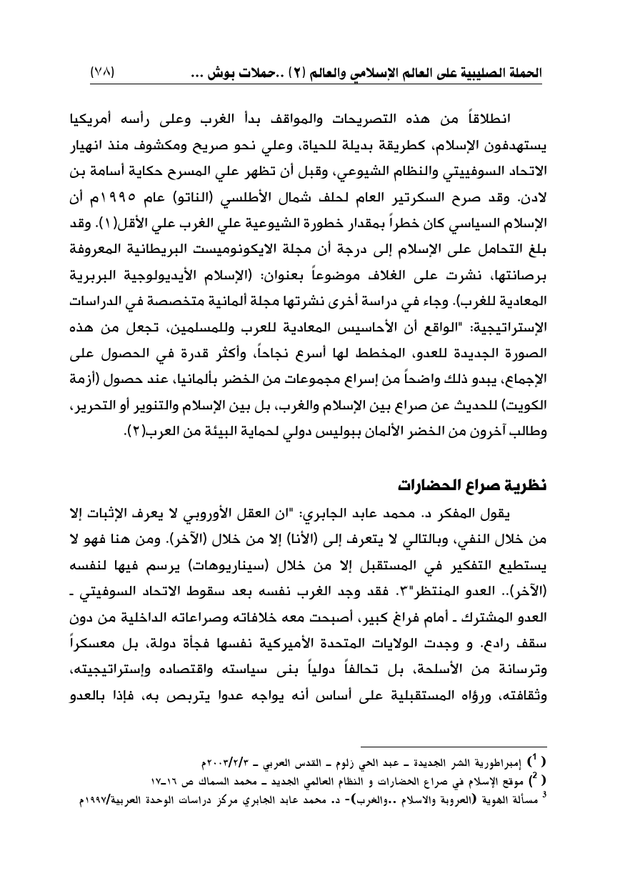 انطلاقاً من هذه التصريحات والمواقف بدأ الغرب وعلى رأسه أمريكيا يستهدفون الإسلام، كطريقة بديلة للحياة، وعلي نحو صريح ومكشوف منذ انهيار الاتحاد السوفييتي والنظام الشيوعي، وقبل أن تظهر علي المسرح حكاية أسامة بن لادن. وقد صرح السكرتير العام لحلف شمال الأطلسي (الناتو) عام 1995م أن الإسلام السياسي كان خطراً بمقدار خطورة الشيوعية علي الغرب علي الأقل (¬1). وقد بلغ التحامل على الإسلام إلى درجة أن مجلة الايكونوميست البريطانية المعروفة برصانتها، نشرت على الغلاف موضوعاً بعنوان: (الإسلام الأيديولوجية البربرية المعادية للغرب). وجاء في دراسة أخرى نشرتها مجلة ألمانية متخصصة في الدراسات الإستراتيجية: "الواقع أن الأحاسيس المعادية للعرب وللمسلمين، تجعل من هذه الصورة الجديدة للعدو، المخطط لها أسرع نجاحاً، وأكثر قدرة في الحصول على الإجماع، يبدو ذلك واضحاً من إسراع مجموعات من الخضر بألمانيا، عند حصول (أزمة الكويت) للحديث عن صراع بين الإسلام والغرب، بل بين الإسلام والتنوير أو التحرير، وطالب آخرون من الخضر الألمان ببوليس دولي لحماية البيئة من العرب (¬2).