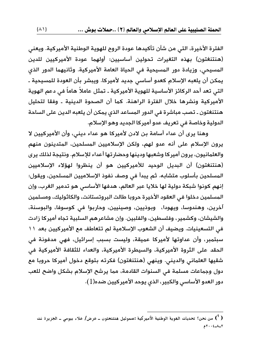 الفترة الأخيرة، التي من شأن تأكيدها عودة الروح للهوية الوطنية الأميركية. ويعني (هنتنغتون) بهذه التغيرات تحولين أساسيين: أولهما عودة الأميركيين للدين المسيحي، وزيادة دور المسيحية في الحياة العامة الأميركية. وثانيهما الدور الذي يمكن أن يلعبه الإسلام كعدو أساسي جديد لأميركا. ويبشر بأن العودة للمسيحية ـ التي تعد أحد الركائز الأساسية للهوية الأميركية ـ تمثل عاملاً هاماً في دعم الهوية الأميركية ونشرها خلال الفترة الراهنة. كما أن الصحوة الدينية ـ وفقا لتحليل هنتنغتون ـ تصب مباشرة في الدور المساعد الذي يمكن أن يلعبه الدين على الساحة الدولية وخاصة في تعريف عدو أميركا الجديد وهو الإسلام.