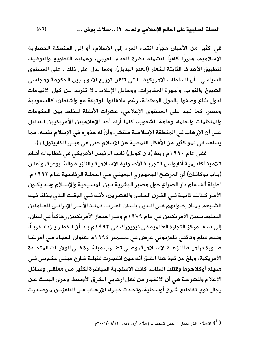 ففي عام 1990م ربط (دان كويل) نائب الرئيس الأمريكي في خطاب له أمام تلاميذ أكاديمية أنابولس التجربة الأصولية الإسلامية بالنازية والشيوعية، وأعلن (باب بوكانان) أي المرشح الجمهوري اليميني في الحملة الرئاسية عام 1992م: "طيلة ألف عام دار الصراع حول مصير البشرية بين المسيحية والإسلام وقد يكون الأمر كذلك ثانية في القرن الحادي والعشرين، لأنه في الوقت الذي يذلنا فيه الشيعة، يملآ إخوانهم في الدين بلدان الغرب. فمنذ الأسر الإيراني للعاملين الدبلوماسيين الأمريكيين في عام 1979م وعبر احتجاز الأمريكيين رهائناً في لبنان، إلى نسف مركز التجارة العالمية في نيويورك في 1993م بدا أن الخطر يزداد قرباً، وقدم فيلم وثائقي تلفزيوني عرض في ديسمبر 1994م بعنوان الجهاد في أمريكا صورة درامية للنزعة الإسلامية، وهي تضرب مباشرة في الولايات المتحدة الأمريكية، وبلغ من قوة هذا القلق أنه حين انفجرت قنبلة خارج مبنى حكومي في مدينة أوكلاهوما وقتلت المئات، كانت الاستجابة المباشرة لكثير من معلقي وسائل الإعلام وللشرطة هي أن الانفجار من فعل إرهابي الشرق الأوسط، وجرى البحث عن رجال ذوي تقاطيع شرق أوسطية، وتحدث خبراء الإرهاب في التلفزيون، وصدرت
