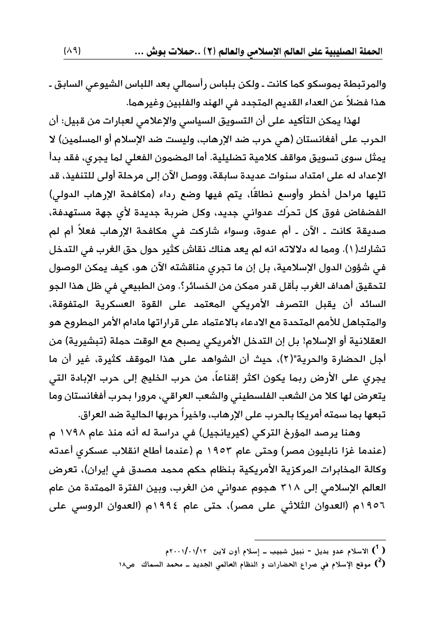 لهذا يمكن التأكيد على أن التسويق السياسي والإعلامي لعبارات من قبيل: أن الحرب على أفغانستان (هي حرب ضد الإرهاب، وليست ضد الإسلام أو المسلمين) لا يمثل سوى تسويق مواقف كلامية تضليلية. أما المضمون الفعلي لما يجري، فقد بدأ الإعداد له على امتداد سنوات عديدة سابقة، ووصل الآن إلى مرحلة أولى للتنفيذ، قد تليها مراحل أخطر وأوسع نطاقًا، يتم فيها وضع رداء (مكافحة الإرهاب الدولي) الفضفاض فوق كل تحرّك عدواني جديد، وكل ضربة جديدة لأي جهة مستهدفة، صديقة كانت ـ الآن ـ أم عدوة، وسواء شاركت في مكافحة الإرهاب فعلاً أم لم تشارك (¬1). ومما له دلالاته انه لم يعد هناك نقاش كثير حول حق الغرب في التدخل في شؤون الدول الإسلامية، بل إن ما تجري مناقشته الآن هو، كيف يمكن الوصول لتحقيق أهداف الغرب بأقل قدر ممكن من الخسائر؟. ومن الطبيعي في ظل هذا الجو السائد أن يقبل التصرف الأمريكي المعتمد على القوة العسكرية المتفوقة، والمتجاهل للأمم المتحدة مع الادعاء بالاعتماد على قراراتها مادام الأمر المطروح هو العقلانية أو الإسلام! بل إن التدخل الأمريكي يصبح مع الوقت حملة (تبشيرية) من أجل الحضارة والحرية" (¬2)، حيث أن الشواهد على هذا الموقف كثيرة، غير أن ما يجري على الأرض ربما يكون اكثر إقناعاً، من حرب الخليج إلى حرب الإبادة التي يتعرض لها كلا من الشعب الفلسطيني والشعب العراقي، مرورا بحرب أفغانستان وما تبعها بما سمته أمريكا بالحرب على الإرهاب، واخيراً حربها الحالية ضد العراق.