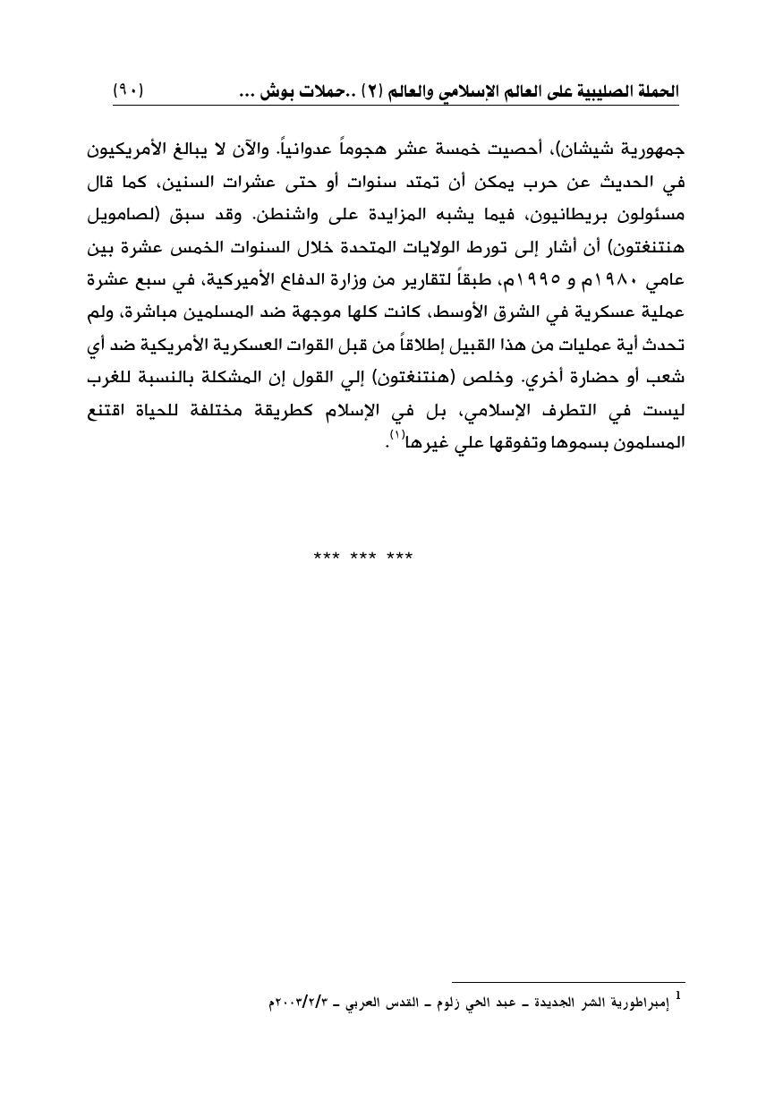 جمهورية شيشان)، أحصيت خمسة عشر هجوماً عدوانياً. والآن لا يبالغ الأمريكيون في الحديث عن حرب يمكن أن تمتد سنوات أو حتى عشرات السنين، كما قال مسئولون بريطانيون، فيما يشبه المزايدة على واشنطن. وقد سبق (لصامويل هنتنغتون) أن أشار إلى تورط الولايات المتحدة خلال السنوات الخمس عشرة بين عامي 1980م و 1995م، طبقاً لتقارير من وزارة الدفاع الأميركية، في سبع عشرة عملية عسكرية في الشرق الأوسط، كانت كلها موجهة ضد المسلمين مباشرة، ولم تحدث أية عمليات من هذا القبيل إطلاقاً من قبل القوات العسكرية الأمريكية ضد أي شعب أو حضارة أخري. وخلص (هنتنغتون) إلي القول إن المشكلة بالنسبة للغرب ليست في التطرف الإسلامي، بل في الإسلام كطريقة مختلفة للحياة اقتنع المسلمون بسموها وتفوقها علي غيرها (¬1).
