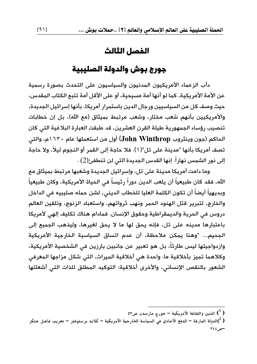 دأب الزعماء الأمريكيون المدنيون والسياسيون على التحدث بصورة رسمية عن الأمة الأمريكية، كما لو أنها أمة مسيحية، أو على الأقل أمة تتبع الكتاب المقدس، حيث وصف كل من السياسيين ورجال الدين باستمرار أمريكا، بأنها إسرائيل الجديدة، والأمريكيين بأنهم شعب مختار، وشعب مرتبط بميثاق (مع الله)، بل إن خطابات تنصيب رؤساء الجمهورية طيلة القرن العشرين، قد طبقت العبارة البلاغية التي كان الحاكم (جون وينثروب John Winthrop) أول من استعملها عام 1630م، والتي تصف أمريكا بأنها "مدينة على تل" (¬1). فلا حاجة إلى القمر أو النجوم ليلاً، ولا حاجة إلى نور الشمس نهاراً. إنها القدس الجديدة التي لن تنطفئ (¬2).