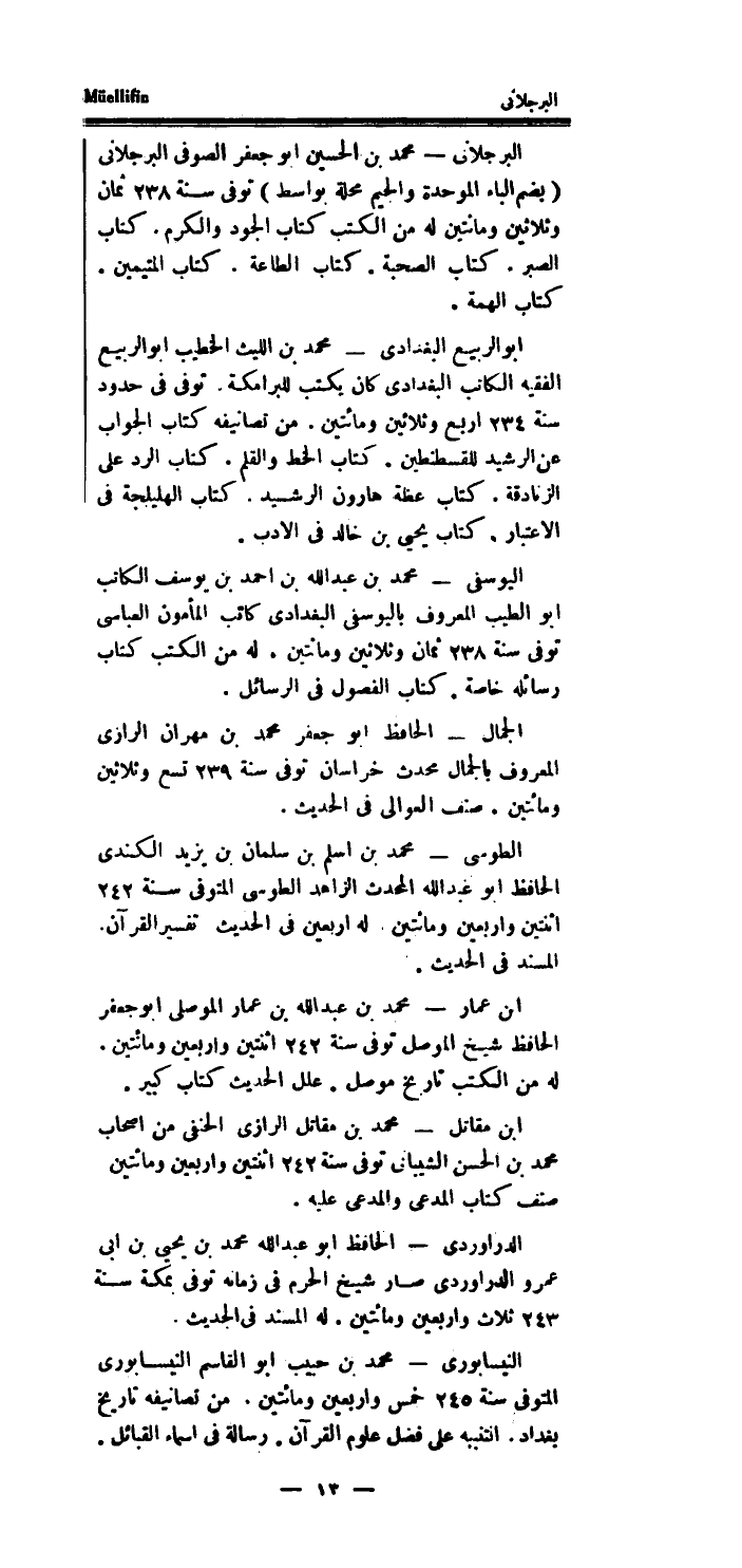 البرجلانى - مُحَمَّد بن الْحُسَيْن أَبُو جَعْفَر الصوفى البرجلانى (بِضَم الْيَاء الْمُوَحدَة وَالْجِيم محلّة بواسط) توفى سنة 238 ثَمَان وَثَلَاثِينَ وَمِائَتَيْنِ لَهُ من الْكتب كتاب الْجُود وَالْكَرم.