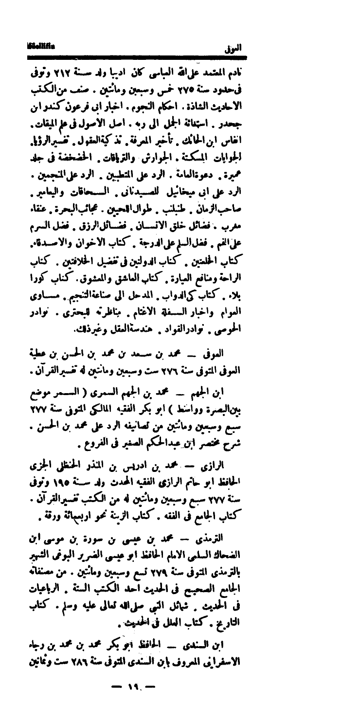 التِّرْمِذِيّ - مُحَمَّد بن عِيسَى بن سُورَة بن مُوسَى ابْن الضَّحَّاك السلمى الامام الحافط أَبُو عِيسَى الضَّرِير البوغى الشهير بالترمذى الْمُتَوفَّى سنة 279 تسع وَسبعين وائتين.