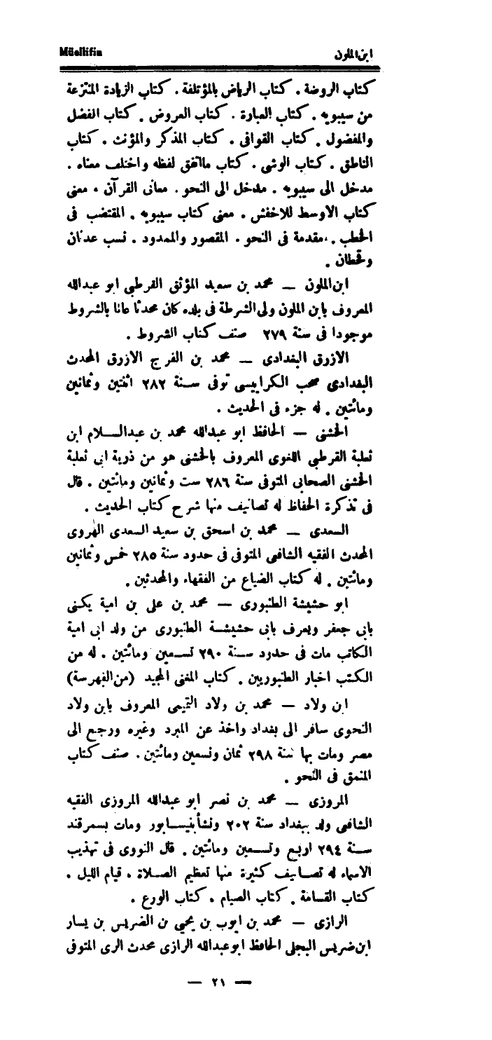 كتاب المغنى الْمجِيد (من الفهرسة) ابْن ولاد - مُحَمَّد بن ولاد التَّمِيمِي الْمَعْرُوف بِابْن ولاد النَّحْوِيّ سَافر إِلَى بَغْدَاد واخذ عَن الْمبرد وَغَيره وَرجع إِلَى مصر وَمَات بهَا سنة 298 ثَمَان وَتِسْعين وَمِائَتَيْنِ.