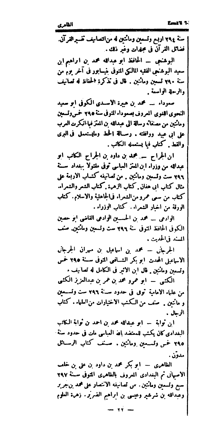 الظاهرى - أَبُو بكر مُحَمَّد بن دَاوُد بن على بن خلف الاصبهاني ثمَّ الْبَغْدَادِيّ الْمَعْرُوف بالظاهرى الْمُتَوفَّى سنة 297 سبع وَتِسْعين وَمِائَتَيْنِ.