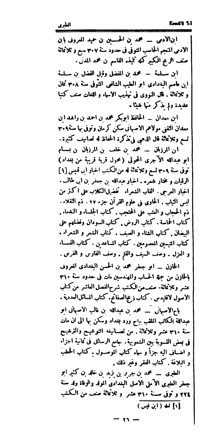 الطَّبَرِيّ - مُحَمَّد بن جرير بن يزِيد بن خَالِد بن كثير أَبُو جَعْفَر الطَّبَرِيّ الآملي الاصل الْبَغْدَادِيّ المولد والوفاة ولد سنة 224 وَتوفى سنة 310 عشر وثلاثمائة صنف من الْكتب