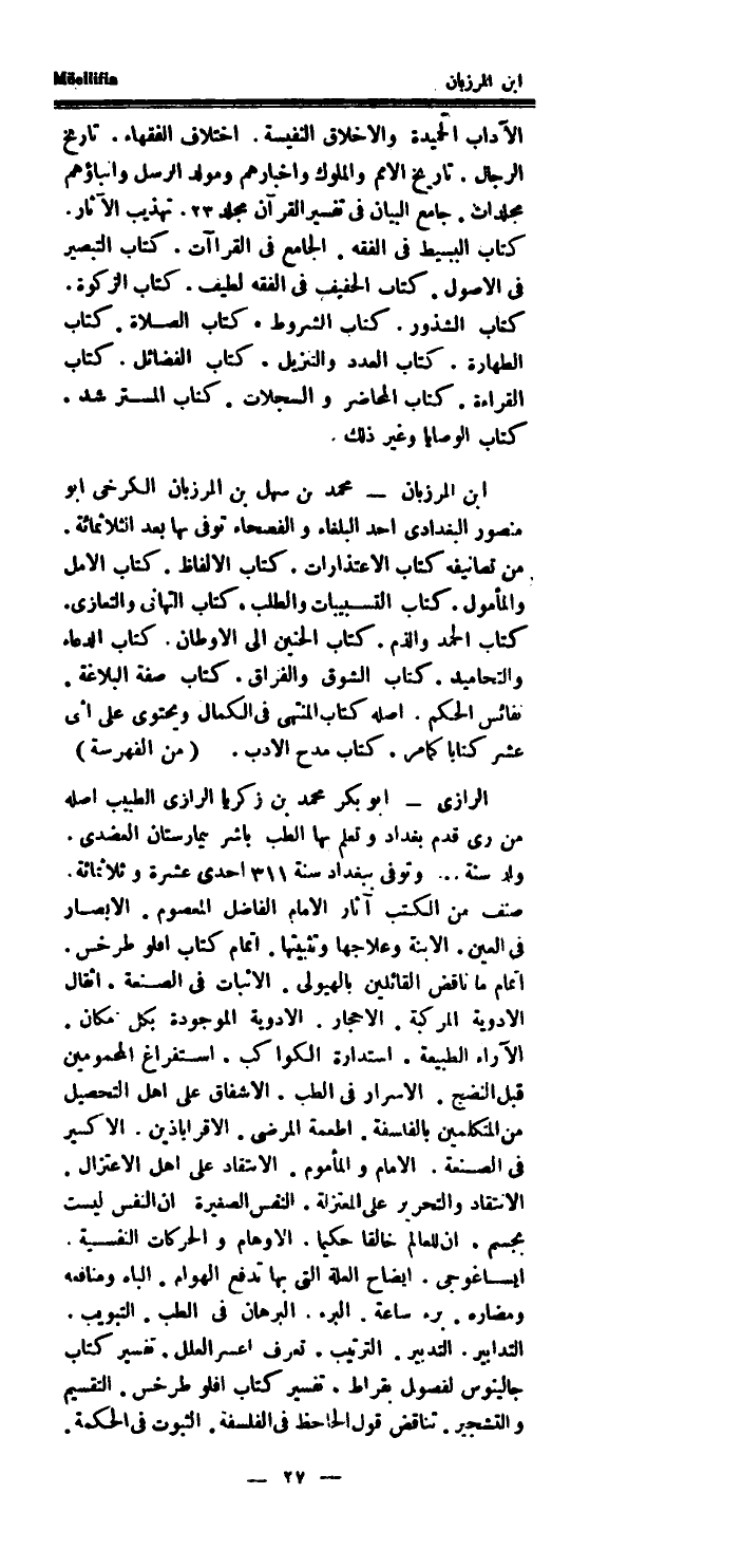 (من الفهرسة) الرَّازِيّ - أَبُو بكر مُحَمَّد بن زَكَرِيَّا الرَّازِيّ الطَّبِيب اصله من رى قدم بَغْدَاد وَتعلم بهَا الطِّبّ بَاشر بيمارستان العضدي.