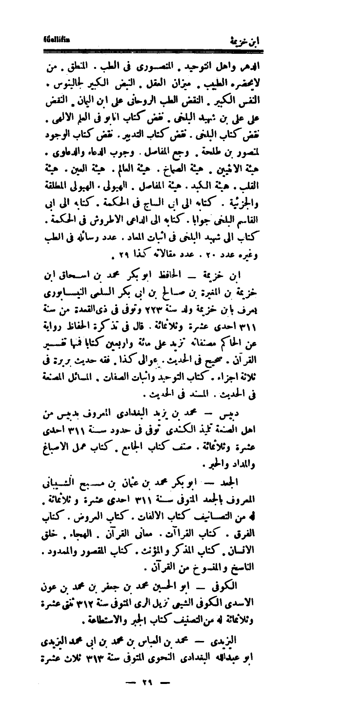 ابْن خُزَيْمَة - الْحَافِظ أَبُو بكر مُحَمَّد بن اسحاق ابْن خُزَيْمَة بن الْمُغيرَة بن صَالح بن ابى بكر السلمى النَّيْسَابُورِي يعرف بِابْن خُزَيْمَة ولد سنة 223 وَتوفى فِي ذى الْقعدَة من سنة 311 احدى عشرَة وثلاثمائة.