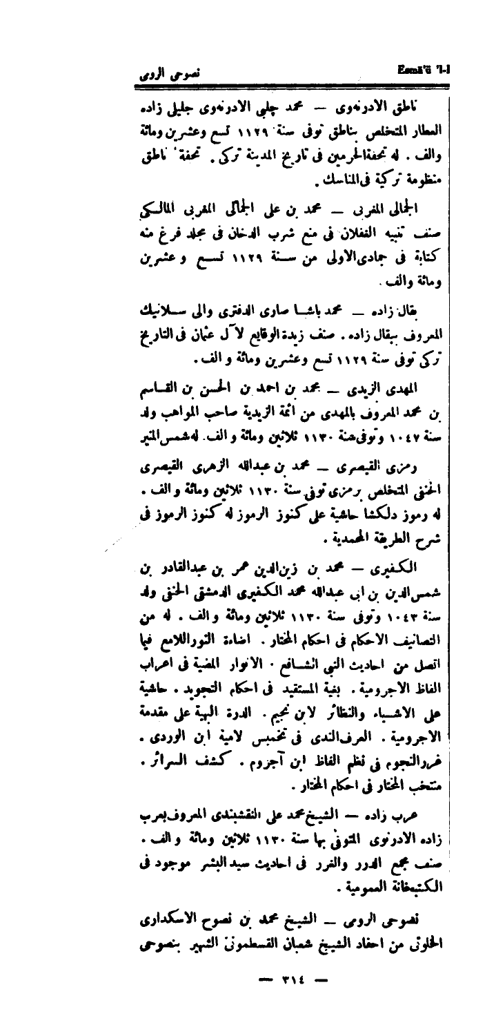 عرب زَاده الشَّيْخ مُحَمَّد على النقشبندى الْمَعْرُوف بعرب زَاده الادرنوى الْمُتَوفَّى بهَا سنة 1130 ثَلَاثِينَ وَمِائَة والف.