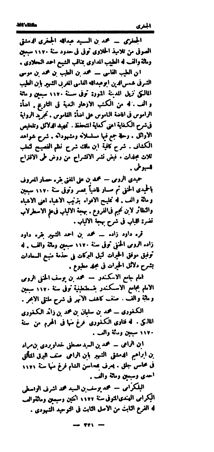 الْجَعْفَرِي مُحَمَّد بن السَّيِّد عبد الله الْجَعْفَرِي الدِّمَشْقِي الصوفى من تلاميذ الخلاوى توفى فِي حُدُود سنة 1170 سبعين وَمِائَة والف لَهُ الطَّبِيب المداوى بمناقب الشيع احْمَد النحلاوى.