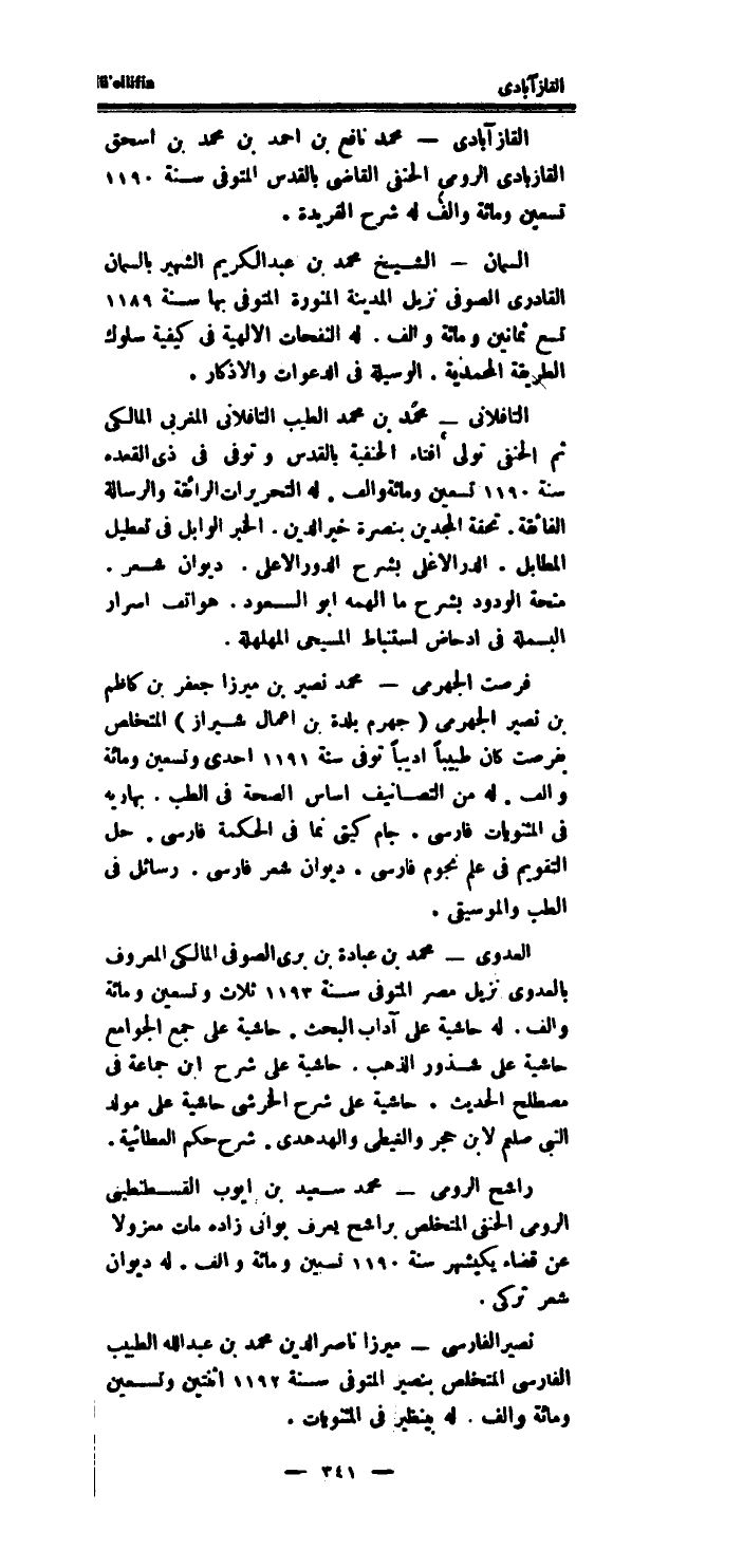 القازآبادى مُحَمَّد نَافِع بن احْمَد بن مُحَمَّد بن اسحق القازبادى الرُّومِي الْحَنَفِيّ القاضى بالقدس الْمُتَوفَّى سنة 1190 تسعين وَمِائَة والف هَل شرح الفريدة.
