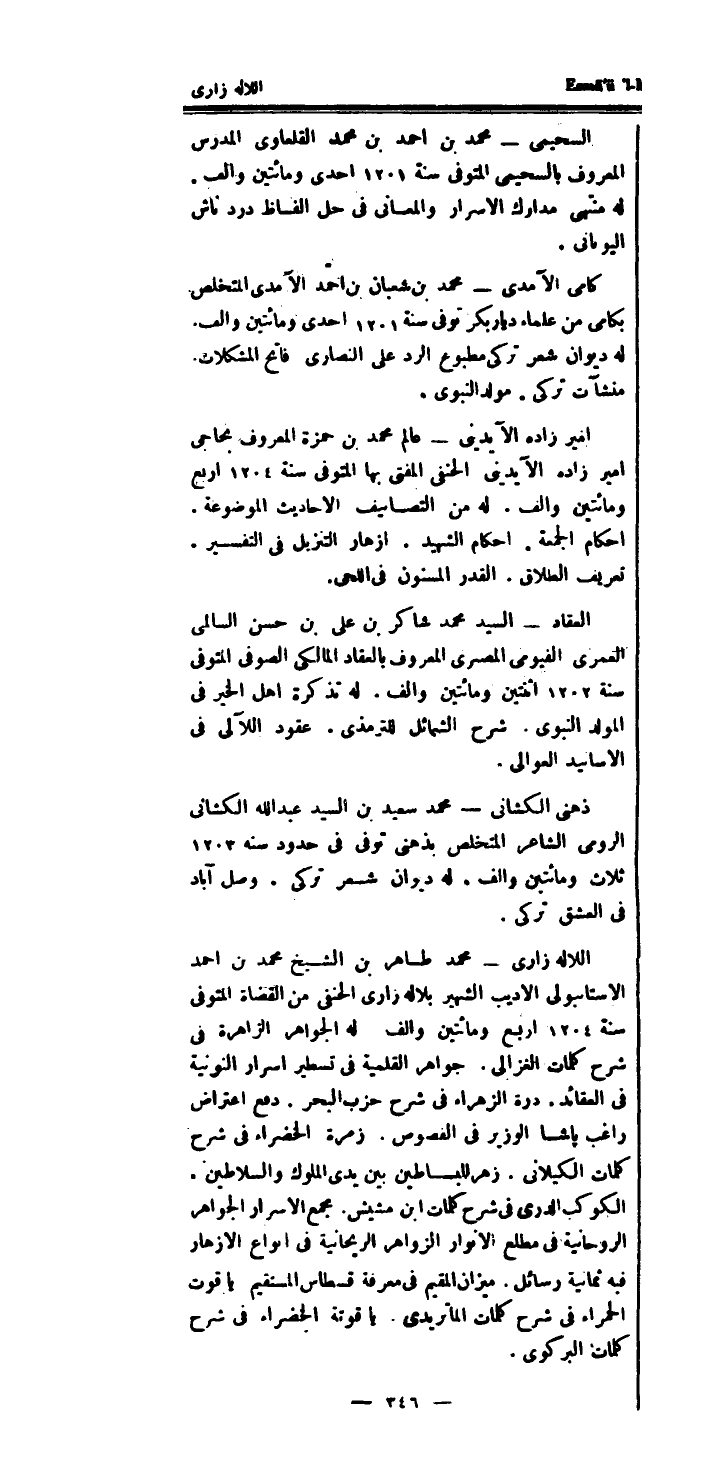 اللاله زارى مُحَمَّد طَاهِر بن الشَّيْخ مُحَمَّد بن احْمَد الاستانبولى الاديب الشهير بلاله زارى الْحَنَفِيّ من الْقُضَاة الْمُتَوفَّى سنة 1204 ارْبَعْ وَمِائَتَيْنِ والف لَهُ الْجَوَاهِر الزاهرة فِي شرح كَلِمَات الْغَزالِيّ.