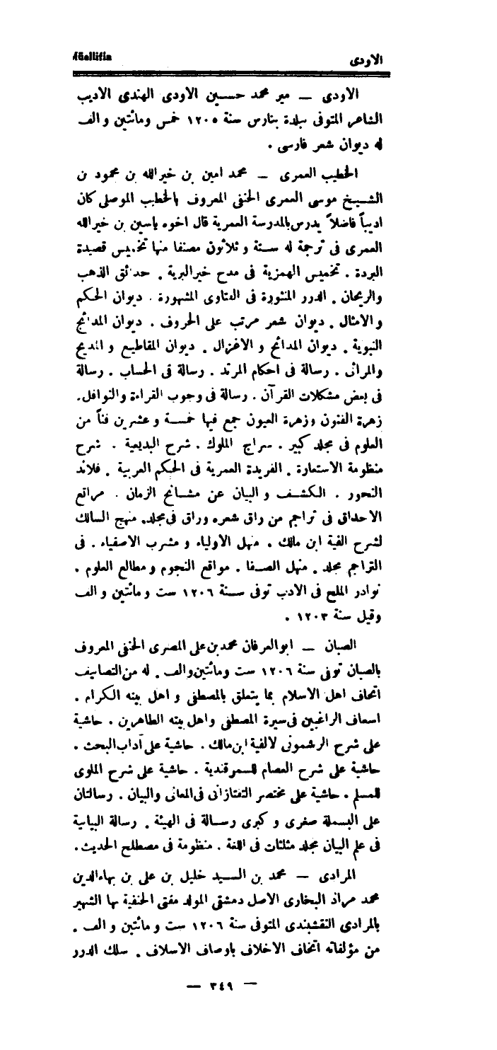 المرادى مُحَمَّد بن السَّيِّد خَلِيل بن على بن بهاء الدَّين مُحَمَّد مراذ البُخَارِيّ الاصل دمشقي المولد مفتى الْحَنَفِيَّة بهَا الشهير بالمرادى النقشبندى الْمُتَوفَّى سنة 1206 سِتّ وَمِائَتَيْنِ والف.