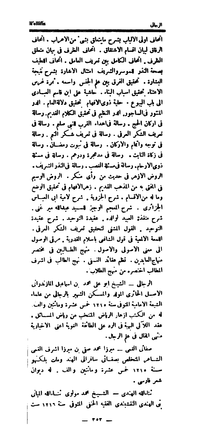 الرجالي الشَّيْخ أَبُو على مُحَمَّد بن اسماعيل المازندرانى الاصل الحائري المولد والمسكن الشهير بالرجالى من عُلَمَاء الشِّيعَة الامامية الْمُتَوفَّى سنة 1215 خمس عشرَة وَمِائَتَيْنِ والف لَهُ من الْكتب ازهار الرياض الْمُنْتَخب من رياض الْمسَائِل.