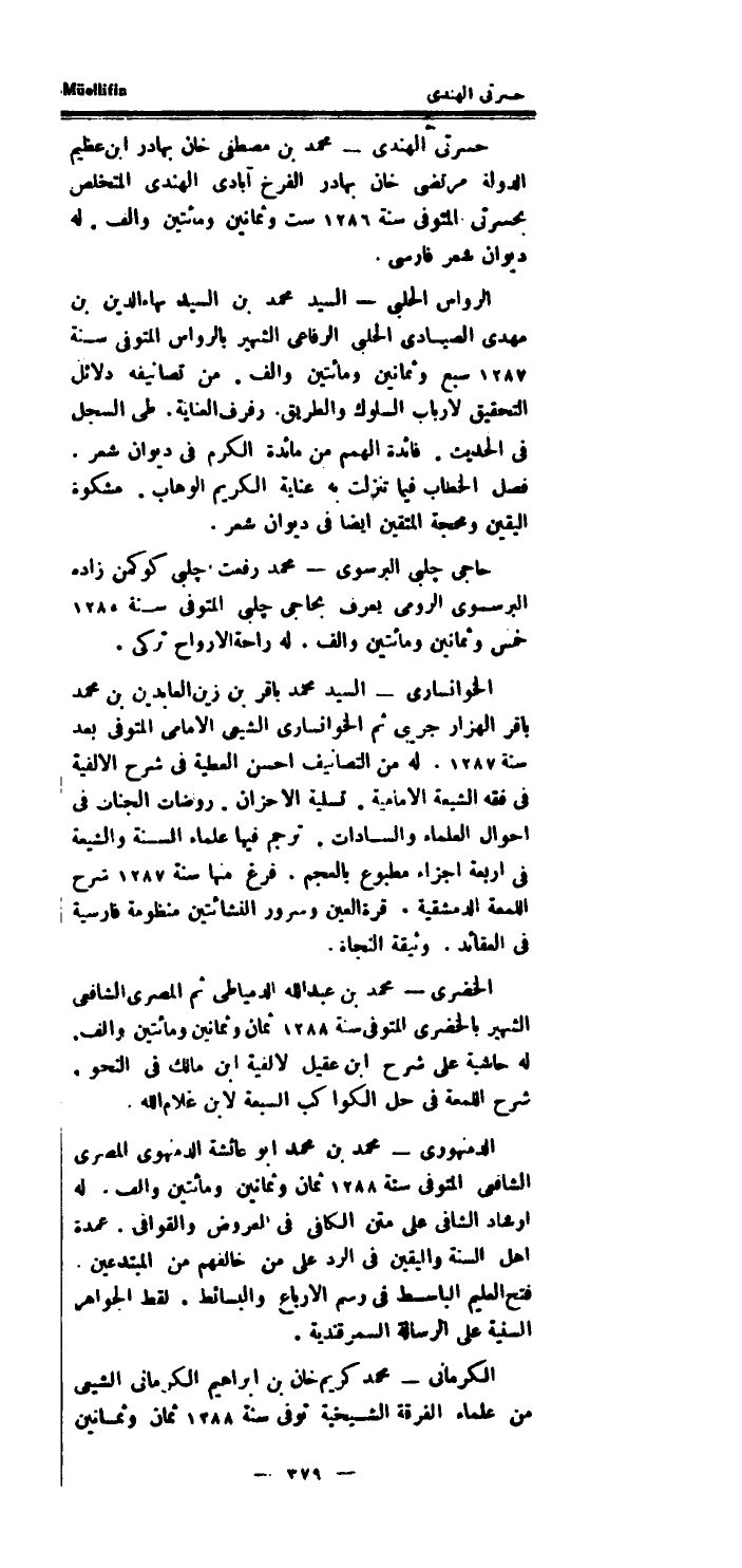 حسرتى الْهِنْدِيّ مُحَمَّد بن مصطفى خَان بهادر ابْن عَظِيم الدولة مرتضى خَان بهادر الفرخ آبادى الْهِنْدِيّ المتخلص بحسرتي الْمُتَوفَّى سنة 1286 سِتّ وَثَمَانِينَ وَمِائَتَيْنِ والف.