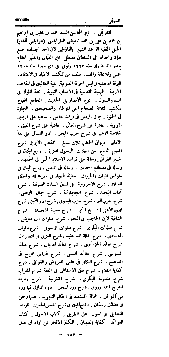 القاوقجى أَبُو المحاسن السَّيِّد مُحَمَّد بن خَلِيل بن ابراهيم بن مُحَمَّد بن على بن مُحَمَّد المشيشى الطرابلسي (طرابلس الشَّام) الْحَنَفِيّ الْفَقِيه الزَّاهِد الشهير بالقاوقجى لَان اُحْدُ اجداده صنع قاؤقا واهداه إِلَى السُّلْطَان مصطفى خَان العثماني واشتهر اعقابه بِهَذِهِ النِّسْبَة ولد سنة 1222 وَتوفى فِي ذى الْحجَّة سنة 1305 خمس وثلاثمائة والف.