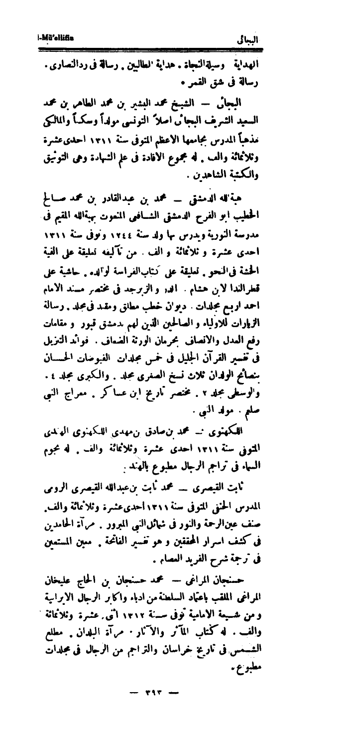 البجائى الشَّيْخ مُحَمَّد البشير بن مُحَمَّد الطَّاهِر بن مُحَمَّد السعيد الشريف البجائى اصلا التونسى مولدا وسكا والمالكي مذهبا الْمدرس بجامعها الاعظم الْمُتَوفَّى سنة 1311 احدى عشرَة وثلاثمائة والف.