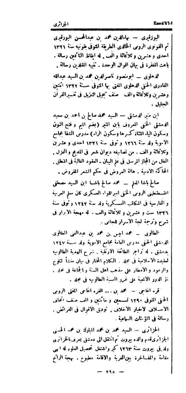 الجزائري السَّيِّد مُحَمَّد بن مُحَمَّد الْمُبَارك بن مُحَمَّد الْحسنى الجزائري قدم وَالِده بيروت ثمَّ انْتقل إِلَى دمشق يعرف بالجزائري ولد فِي بيروت سنة 1263 كبر واشتغل تَحْصِيل الْعُلُوم لَهُ أبهى مقامة والمفاخرة بَين الغربة والاقامة مطبوع.